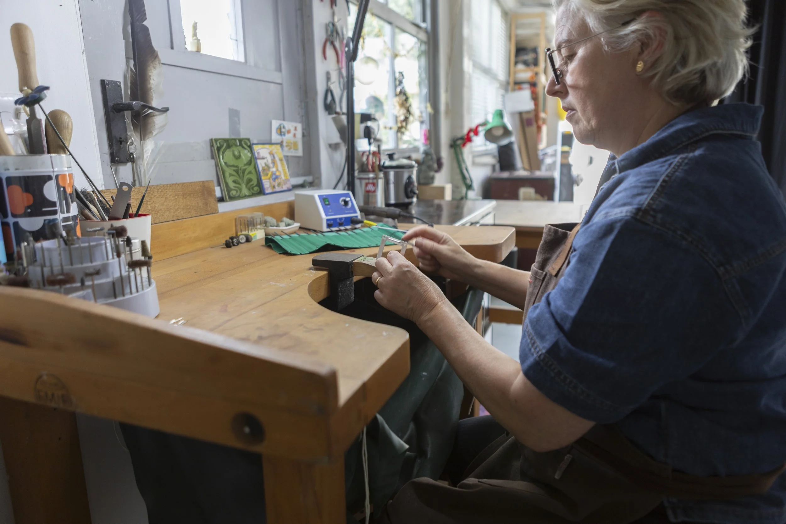 Heather Blake is a contemporary jewellery artist combining the materials and techniques of shoemaking with goldsmithing and lapidary.